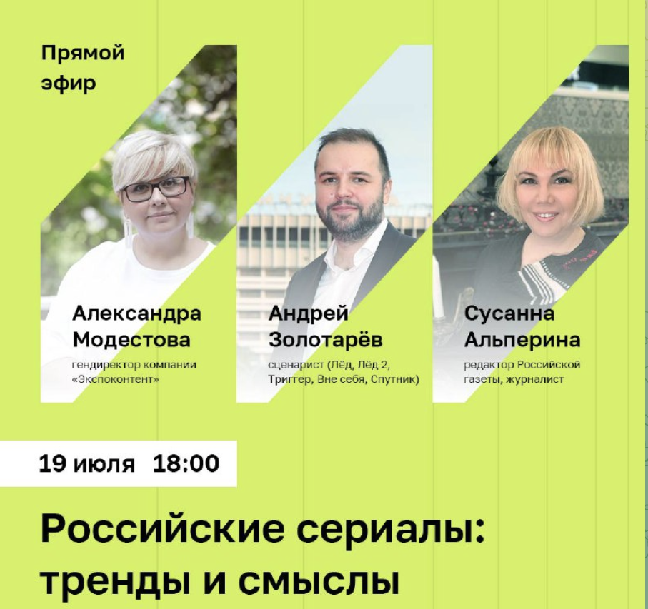 В онлайн-обсуждении участвуют: сценарист проектов «Лед», «Вне себя», «Триггер» Андрей Золотарёв и гендиректор компании «Экспоконтент» Александра Модестова — члены жюри «Пилота» в этом году. Дискуссию проведет журналист Сусанна Альперина.