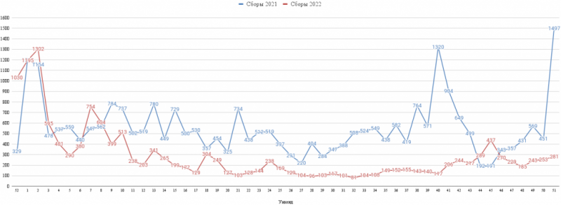 С 9 уикенда 2022 года, выпавшего на 24-27 февраля, общие сборы Топ-10 по итогам выходных лишь дважды — на 44 и 45 уикендах — превысили суммарную кассу десятки лидеров по отношению к соответствующим выходным 2021 года. Подобные результаты были во многом обусловлены с одной стороны — довольно слабыми релизами, входившими в кинотеатрах в соответствующие периоды 2021, с другой — показателями «Сердца пармы», ставшего спасительным кругом для российских кинотеатров минувшей осенью.