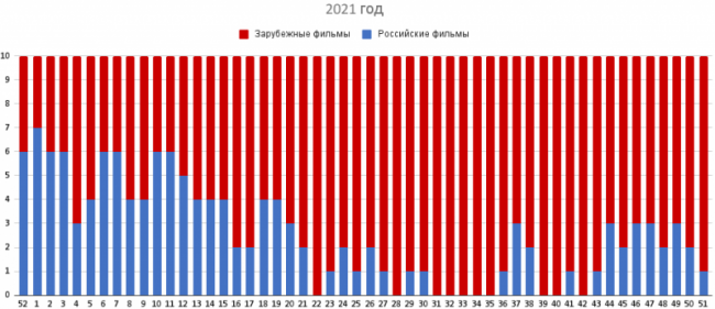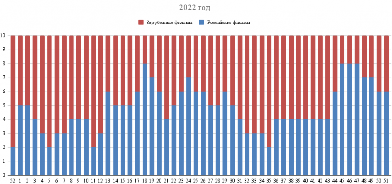 Соотношение количества зарубежных и российских фильмов в еженедельных Топ-10 в 2022 и 2021 гг.