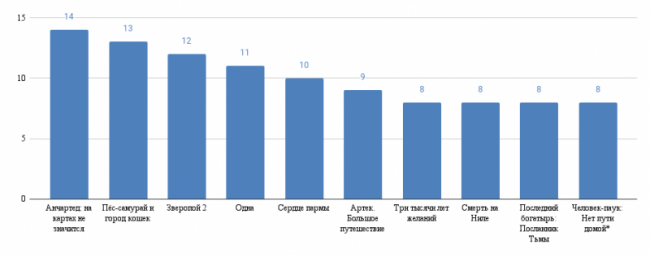 Шесть картин вошло в рейтинг Топ-10, заработав менее 300 млн рублей. Если бы в России присутствовали мейджоры, эти проекты расположились бы не выше 30 места.