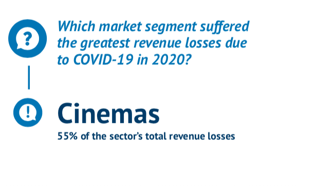 Этот ущерб был нанесен в результате длительного закрытия кинотеатров с марта по май, а потом и с ноября во время второй волны пандемии. Кроме того, многие блокбастеры, первоначально запланированные на 2020 год, отложили свой кинотеатральный релиз или вышли на онлайн-платформах.