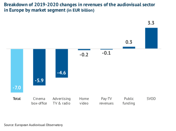 Из-за пандемии в 2020 году выручка европейского аудиовизуального сектора сократилась на 6%, вернувшись к уровню 2015 года. Коронавирус грянул в то время, когда сектор уже находился в состоянии стагнации и с учетом инфляции фактически понес потери в 7 млрд евро.
