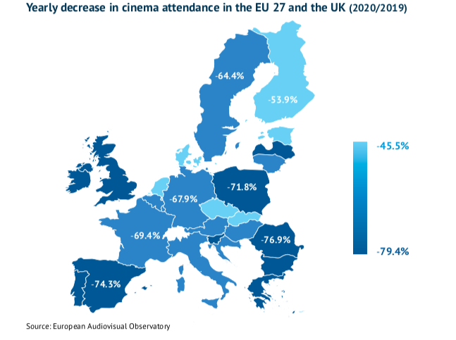 Продажи билетов резко упали во всех европейских странах. Самое «терпимое» снижение посещаемости зарегистрировано в Дании (–45,5%), Эстонии (–51,2%), Финляндии (–53,9%) и Нидерландах (–55,9%), в то время как самое значительное снижение было на Кипре (–79,4%), в Румынии (–76,9%), Словении (–76,2%), Португалии (–75,5%), Ирландии (–75,4%) и Великобритании (–75,0%). За пределами ЕС и Великобритании кинотеатральные рынки тоже пострадали, но сравнительно меньше: в Норвегии (–57,5%), России (–59,5%) и Исландии (–59,9%).