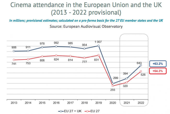 На этой неделе Европейская аудиовизуальная обсерватория / European Audiovisual Observatory опубликовала новый аналитический отчет, исходя из которого, посещаемость кинотеатров в Европейском союзе и Великобритании в 2022 году выросла чуть больше, чем на 63%, что все еще ниже средних показателей до пандемии.