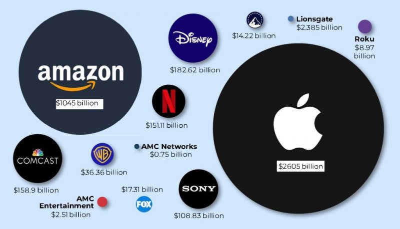 Очевидно, что и независимый характер, и схожие планы в кинопрокате — это все связано с тем, что для Apple и Amazon, очень и очень богатых компаний, кино и сериалы далеко не основной бизнес. Можно просто взглянуть на последние данные по капитализации важнейших игроков рынка. Amazon и Apple напоминают планеты-гиганты. По сравнению и с Netflix, Disney, Sony и Comcast (последняя — это и NBCUniversal и Universal Pictures). И тем более с Paramount, Warner Bros., Fox и Roku. И уж точно по сравнению с такими «карликами», как Lionsgate, AMC Entertainment (важнейшая сесть кинотеатров Северной Америки) и AMC Network (дом для многих нишевых потоковых сервисов, типа хоррор-стриминга Shidder и ориентирующегося на аниме HIDIVE, а также для каналов типа BBC America и Sundance TV). Совсем уж «астероиды» типа IMAX на этой иллюстрации просто отсутствуют.