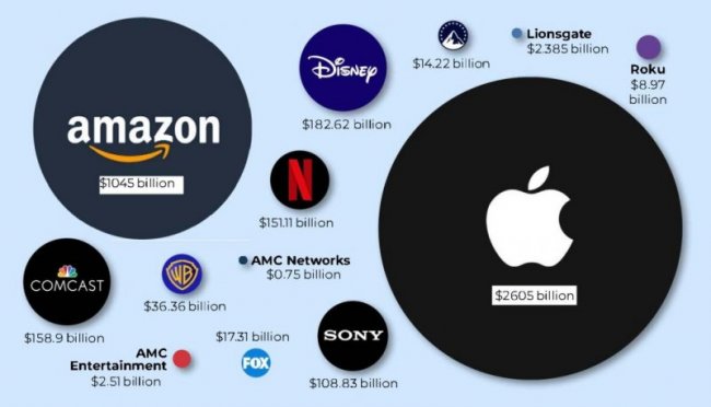 Все эти компании прежде всего имеют дело с индустрией развлечений. Большинство в эпоху пандемии активизировалось в создании или покупке собственных подразделений потокового вещания. Они слишком навязчиво думают о росте числа подписчиков, о доходах от рекламы (а потому рискуют, как Netflix постепенно превратиться в конструктор, в создателя все более усредненного продукта), о слияниях с потенциальными партнерами. То есть, если бы Viacom Corporation и CBS в 2019 году не объединились бы и не превратились в итоге в Paramount Global, ее могло бы и не оказаться на этой картинке. И да, у Sony доходы в сфере бытовой электроники и финансов выше, чем от работы в киноиндустрии. Но ее все же нельзя сравнить с Amazon и Apple, первый из которых завоевал мир своей доставкой, а второй — мобильными устройствами. С двумя колоссами, занимающими вторую и третью строчки в списке Fortune 500 крупнейших компаний США по размеру выручки. У них больше возможностей, они экспериментируют — Apple, например, активно влезает в сферу спортивных трансляций (и наверняка специализирующаяся на спорте Fox печально смотрит на эти эксперименты).
