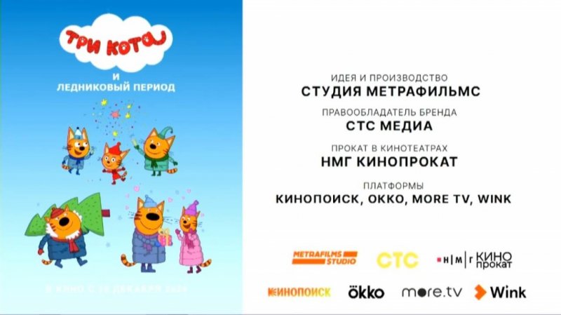 Закрепить успех первой части решила и компания Метрафильмс, представив второй полнометражный фильм франшизы «Три кота» – «Три кота и Ледниковый период». У фильма сменился прокатчик – теперь дистрибьютором стал НМГ Кинопрокат, но остался режиссер Дмитрий Высоцкий, который работал и над первым фильмом «Три кота и море приключений». Картина будет показана на онлайн-платформах Кинопоиск, Окко, more tv и Wink. Релиз запланирован на 19 декабря 2024 года. Эстимейт проекта – 250 млн рублей.