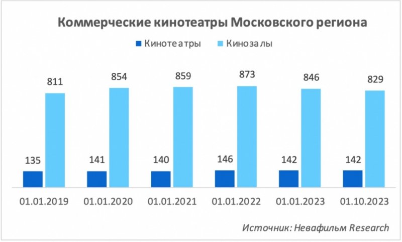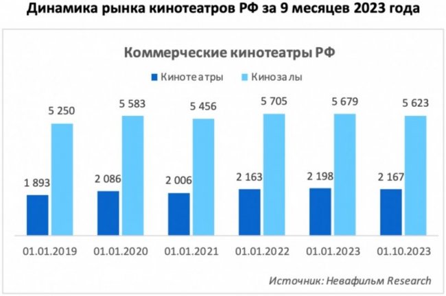 В текущем году, по данным аналитической группы компании Невафильм Research, число коммерческих кинотеатров уменьшилось. На 1 января 2023 года в России было 2198 коммерческих кинотеатров (5679 залов), а на 1 октября — 2167 кинотеатров (5623 зала).