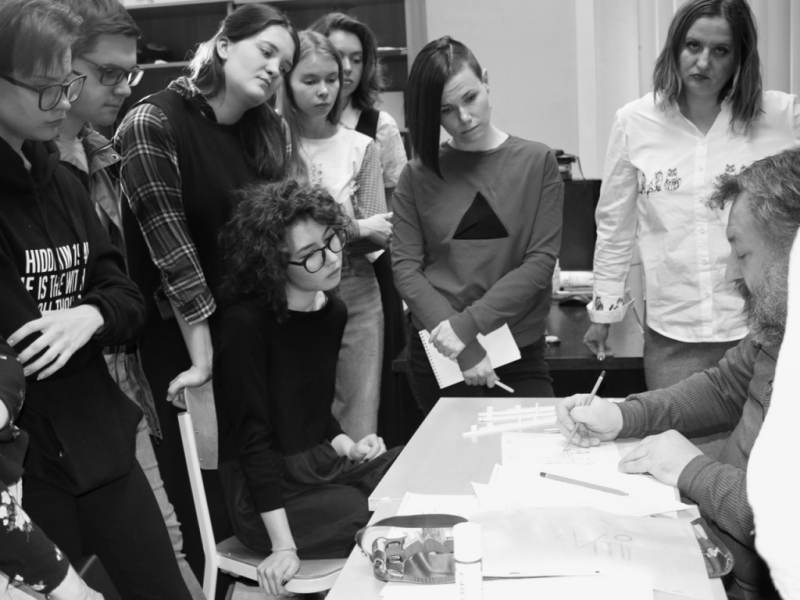Почему это не только школа, но и школа-студия? Мы хотели сразу наладить процесс производства, поскольку он неотделим от образования. Студенты учатся, в частности, на тех работах, которыми заняты их мастера. Затем студенты и сами становятся преподавателями, набирают уже своих учеников и воспитывают их в тесном контакте со своими работами. Эта особенность, с одной стороны, уникальна, с другой – традиционна: можем вспомнить период итальянского Возрождения, когда у каждого крупного мастера были подмастерья, становившиеся ученикам и, а затем – мастерами.