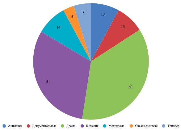 В 2023 году в кинотеатральный прокат вышло 164 отечественных фильма: из них 13 анимационных, 13 документальных и 138 игровых проектов. Среди игровых картин традиционно доминировали комедии и драмы, на которые пришлось 51 и 60 фильмов соответственно. В число драм входят по 6 исторических (3 из которых военных) релизов и 2 спортивные драмы. В число комедий вошло 12 семейных и приключенческих картин. Отдельное внимание обращает на себя жанр сказки: несмотря на небольшое количество релизов, именно за ним оказалось подавляющее количество кассовых сборов. Среди мелодрам в отдельный поджанр выделяется эротика: сразу 3 отечественных картины для взрослых выходили в прокат в текущем году – наиболее ярко отметился проект «Непослушная» (Наше кино) со сборами 264 млн.