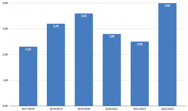 На графике представлена ежегодная сумма сборов всех проектов, выходивших в период новогодних праздников. Подробный анализ новогодних битв последнего пятилетия мы уже приводили в прошлом году. Отметим, что новогодняя битва сезона 22/23, на которую возлагались большие надежды, стала самой успешной в истории отечественного проката и опередила даже допандемийный сезон 19/20.