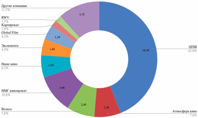 Лидер по итогу года среди дистрибьюторов – компания ЦПШ, чья доля составила 43,9% со сборами в 14,1 млрд. Именно ЦПШ принадлежат все самые громкие релизы года. Всего компания выпустила в прокат 35 проектов. В III и IV кварталах ЦПШ уступала лидерство Экспоненте и НМГ Кинопрокат соответственно, но огромного запаса первого полугодия хватило для итоговой победы.