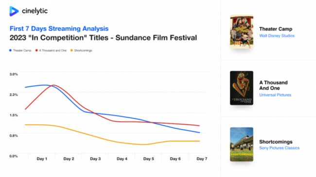 Согласно данным, представленным на графике, видно, что «Театральный лагерь» / «Theater Camp» и «Тысяча и один» / «A Thousand and One» имели более сильные дебюты в OTT по сравнению с «Недостатками» / «Shortcomings». Им обоим удалось в среднем захватить практически одинаковую долю рынка (1,5–1,6%) за первую неделю с релиза. Однако «Театральный лагерь» продемонстрировал более успешный стартовый день, за которым последовал заметный спад, в то время как «Тысяча и один», наоборот, достигла своего пика во второй день, а затем испытала аналогичный спад. «Недостаткам» удалось добиться значительно более низкого среднего показателя за первую неделю (всего 0,6%), но более стабильной линии просмотров за семь дней. «Тысяча и один» получил приз Большого жюри фестиваля, был приобретен компанией Focus Features и вошел в десятку лучших независимых фильмов 2023 года по версии Национального совета кинокритиков США. Ленту выпустили в прокат на 926 экранах — это принесло $3,5 млн кассовых сборов. «Театральный лагерь», который получил несколько стоячих оваций на премьере, был вскоре после показа куплен компанией Searchlight Pictures за $8 млн. Несмотря на менее масштабный прокат на 555 экранах, картине удалось показать более высокие кассовые сборы ($4,6 млн). «Недостатки», хоть и не получили такого же внимания, как две другие картины, были приобретены Sony Pictures Classics и вышли на 404 экранах. За все время проката проект заработал чуть менее $700 000. Если рассматривать предстоящие премьеры Сандэнса 2024, то внимание привлекает новый фильм дуэта кинорежиссеров Анны Боден и Райан Флек, выпустивших в 2019 году супергеройский блокбастер «Капитан Марвел». На фестиваль постановщики приедут вместе с картиной «Freaky Tales», главную роль в которой сыграл Педро Паскаль. Платформа Cinelytic прогнозирует, учитывая 10-миллионный бюджет картины и возможный прокат в кинотеатрах на 800 экранах, что DBO проекта составит чуть более $8,0 млн, а валовая выручка на внутреннем рынке (BO, HV, TV) — около $14,8 млн. Сочетание стратегии выпуска и связанных с этим расходов на рекламную кампанию в медиа, приведет к отрицательной рентабельности этого проекта.