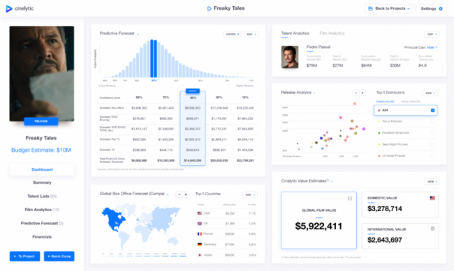 Данный инструмент может быть интересен тем, кто работает на рынке и пытается рассчитать точную сумму, за которую следует покупать или продавать права на каждую территорию. Как показано на графике ниже, Cinelytic оценивает внутреннюю и международную стоимость этого проекта в $3,3 млн и $2,6 млн соответственно, что дает глобальную оценку в $5,9 млн. В итоге, после анализа «Freaky Tales», а также конкурсных картин с прошлогоднего фестиваля, эксперты ожидают, что потенциальный кинотеатральный релиз может помочь фильмам продлить их жизнь на OTT, тем самым, увеличивая их итоговый доход. Учитывая многочисленные премьеры и конкурсные показы, охватывающие десять дней фестиваля Сандэнс, от компаний, покупающих контент, требуется принятие обдуманных решений — оправдан ли кинотеатральный выпуск каждого проекта. В противном случае необходимо изучить альтернативные стратегии, чтобы обеспечить осведомленность у зрителей для успешного дебюта картины на платформах OTT.