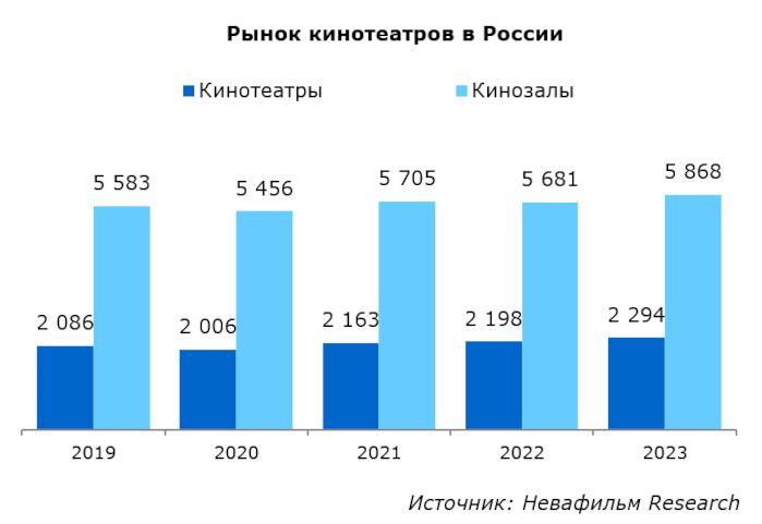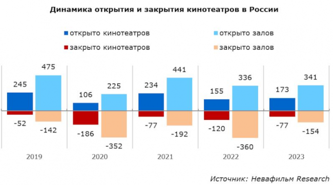 Количество открытых кинотеатров и залов в России в 2023 году превысило количество закрытых: было открыто 173 кинотеатра против 77 закрытых, и 341 зал против 154 закрытых.