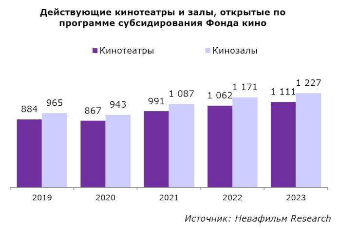 По программе субсидирования Фонда кино, объявленной в 2023 году, было запущено около 80 новых залов. На 01.01.2024 общее количество таких кинотеатров и кинозалов составляет 1111 и 1227 соответственно. Доля кинотеатров, поддержанных Фондом кино, в общем количестве действующих увеличилась с 42% в 2019 году до 48% в 2023, а кинозалов – с 17% до 21%.