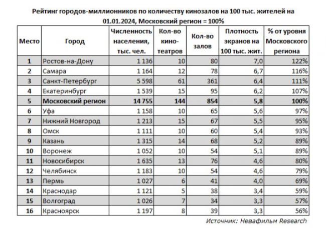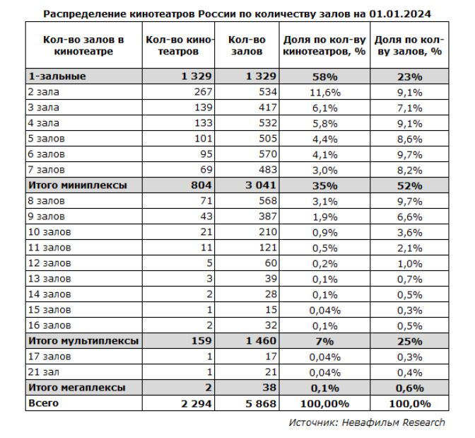 Более половины кинотеатров приходится на однозальные – их доля увеличилась с 55% в 2019 году до 58% в 2023. При этом доля кинозалов в однозальных кинотеатрах составляет 23% рынка (20% в 2019 году). Доля миниплексов (кинотеатров с 2-7 залами) в 2023 году составила 35% рынка, и в них сосредоточено 52% кинозалов (38% и 53% в 2019 году соответственно). Мультиплексы (кинотеатры с 8-16 залами) продолжают удерживать 7% рынка (25% залов).