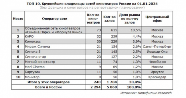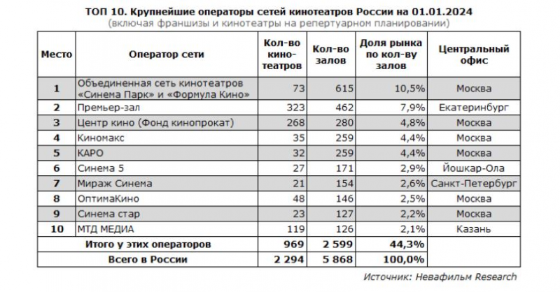 По данным на начало 2024 года, ТОП 10 крупнейших операторов сетей кинотеатров России (включая франшизы и кинотеатры на репертуарном планировании) управляют 44% кинозалов – примерно так же, как по итогам 2022 года. На первом месте находится Объединенная сеть кинотеатров «Синема Парк» и «Формула Кино», которой принадлежат 10,5% залов. На втором месте «Премьер-зал» (7,9%). К концу 2023 года на третье место впервые вышел Фонд кинопрокат с сетью кинотеатров «Центр кино» (4,8%), обогнав сразу и «Киномакс», и «КАРО».