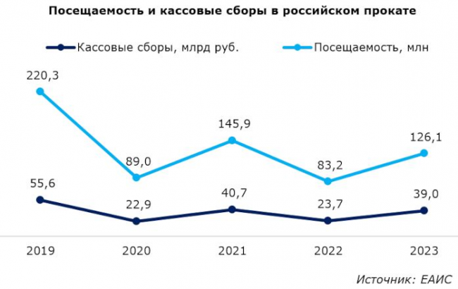 По официальным данным единой федеральной автоматизированной информационной системы сведений о показах фильмов в кинозалах (ЕАИС), кассовые сборы в 2023 году составили 39 млрд рублей, превысив показатель 2022 года на 65%, и уступив 2019 году на 30%. Кинотеатры посетили 126,1 млн человек, что на 51% больше, чем годом ранее, но на 43% меньше, чем в 2019 году.