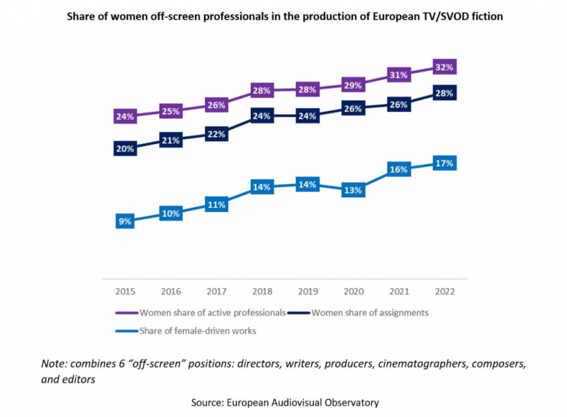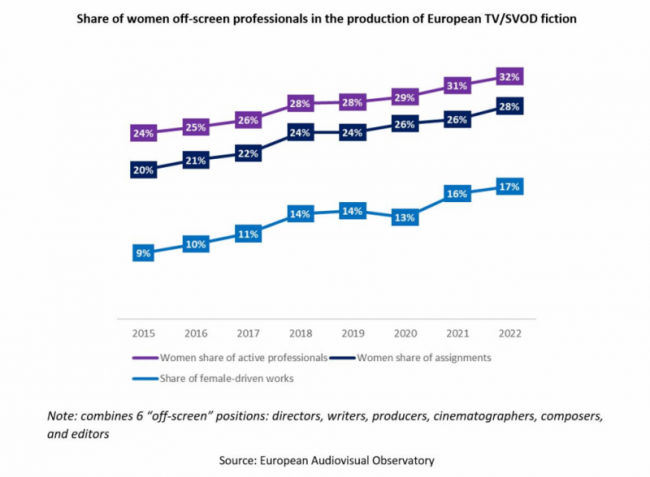 6 февраля Европейская обсерватория / The European Audiovisual Observatory опубликовала новый отчет, в котором проанализировано количество женщин-специалистов, работающих в теле- и стриминговой индустрии в Европе. Согласно результатам исследования, в 2022 году доля женщин составила 28% от общего числа работников отрасли. Гендерное неравенство варьируется в зависимости от специализации. Доля женщин значительно выше среди продюсеров (48%) и сценаристов (37%), близка к среднему уровню у монтажеров (26%) и режиссеров (25%) и серьезно ниже у композиторов (11%) и операторов. Женщины больше представлены в тех категориях, где несколько специалистов работают вместе, как в случае с продюсерами и сценаристами. И наоборот, когда должность обычно занимает только один профессионал (например, режиссер или оператор), женщины, как правило, менее представлены. Но даже для категорий, в которых за создание контента отвечает несколько специалистов, команды, в основном, возглавляют мужчины. Например, в 2022 доля женщин-сценаристов составляла 37% среди всех авторов аудиовизуального контента, но полностью женские команды составляли только 28% от всех сценарных команд. При этом, доля полностью мужских команд авторов составила 56%, а доля гендерно-сбалансированных команд — 16%. В индустрии доля женщин-специалистов в целом увеличилась с 2015 года (доля женщин на всех должностях выросла с 20% до 28%). Но наиболее значительный прогресс был достигнут на должностях с низкой или очень низкой долей женщин (композиторы, операторы, режиссеры), в то время как на таких должностях, как сценаристы или продюсеры, изменения шли медленнее. Если применить темпы роста за последние 8 лет к будущему, то это будет означать установление гендерного равенства в 2029 году для сценаристов, в 2032 году для режиссеров и в 2045 году для композиторов. В 2022 году женщины-режиссеры составляли 28% от общего числа режиссеров игровых эпизодов сериалов и телефильмов в Европе (16% в 2015 году). В среднем в период с 2015 по 2022 год женщины со-режиссировали меньшее количество серий, чем мужчины, и у них было меньше шансов стать единственным режиссером проекта. По этим причинам, доля женщин на должности режиссера была ниже – 25% (15% в 2015 году). Доля эпизодов игровых проектов, снятых командами, возглавляемыми женщинами, снова оказалась немного ниже — 24% (по сравнению с 14% в 2015 году), поскольку женщины чаще работали в командах, возглавляемых мужчинами. В 2021 году женщины-сценаристы составляли 39% от общего числа авторов игровых проектов в Европе (по сравнению с 31% в 2015 году). В период с 2015 по 2022 год женщины в соавторстве написали меньше эпизодов сериалов, чем мужчины, и еще реже были единственными авторами эпизодов. Таким образом, доля женщин-сценаристов была ниже — 37% (28% было в 2015 году). Женщины-сценаристы чаще, чем коллеги-мужчины, участвовали в написании проектов в соавторстве, но происходило это зачастую в командах, в которых большинство составляли мужчины. По этой причине, количество серий, написанных женскими командами, было значительно ниже — 28% (17% в 2015 году).