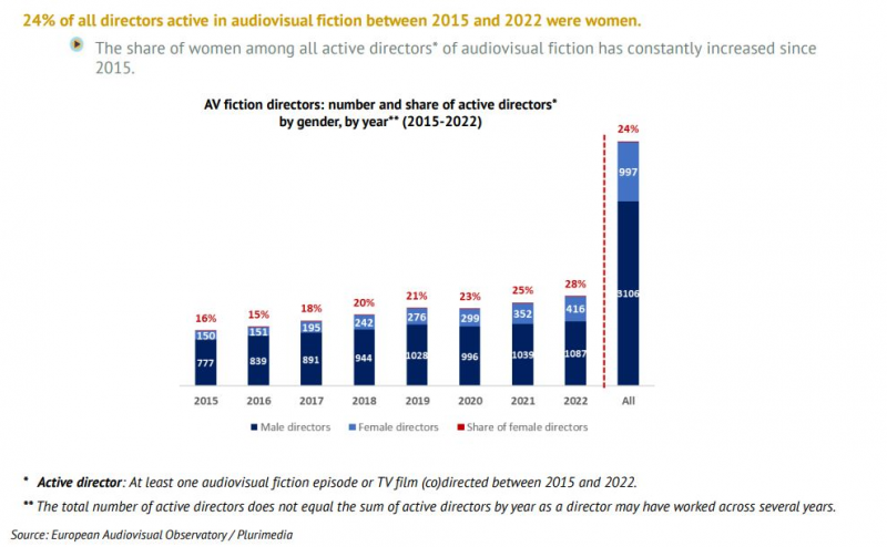 В 2022 году женщины-режиссеры составляли 28% от общего числа режиссеров игровых эпизодов сериалов и телефильмов в Европе (16% в 2015 году). В среднем в период с 2015 по 2022 год женщины со-режиссировали меньшее количество серий, чем мужчины, и у них было меньше шансов стать единственным режиссером проекта. По этим причинам, доля женщин на должности режиссера была ниже – 25% (15% в 2015 году).