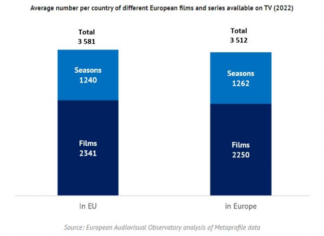 В 2022 в эфире было показано порядка 27 000 и более 32 000 европейских фильмов в ЕС и во всей Европе соответственно. В среднем в одной стране транслировалось около 2 300 европейских фильмов и 1 300 сезонов европейского ТВ-контента.