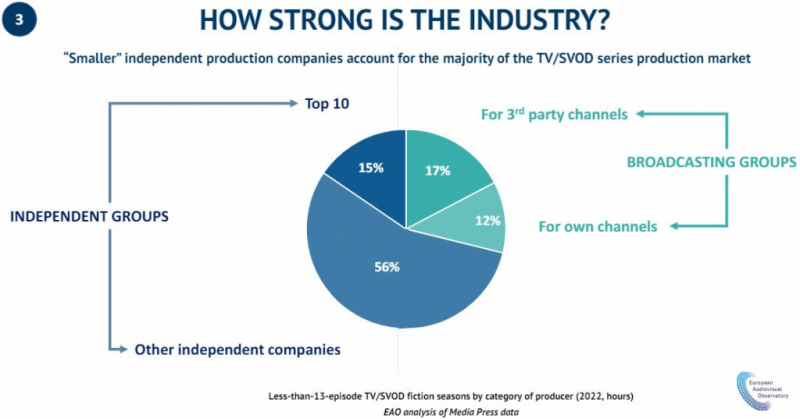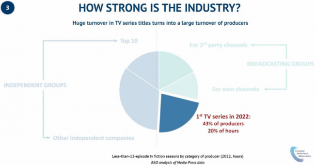 Новички в этом секторе также представляют собой значительную силу, что предполагает здоровую текучесть кадров в индустрии. Число продюсеров, выпустивших свой первый сериал, составило 43% от числа всех продюсеров и 20% от общего количества снятых сериалов. Доля сериалов, произведенных 10 ведущими продюсерами в Европе, не увеличивается.