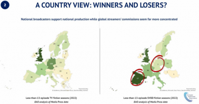 Стриминговые сервисы, как правило, концентрируют свои инвестиции на меньшем количестве стран: в их число входят продюсеры из Испании и Великобритании, за ними следуют Франция и Италия, затем Швеция и Польша, а в Германии, странах Бенилюкса и остальной Европе дела обстоят хуже.