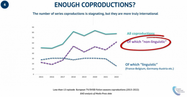 Как отметили участники, количество копродукции в сериалах не растет и ее пока намного меньше, чем в киноиндустрии. Совместное производство проектов между странами, говорящими на одном языке, например, между Германией и Австрией, с 2015 по 2022 год постепенно сокращалось, в то время как количество действительно международной копродукции постепенно растет.