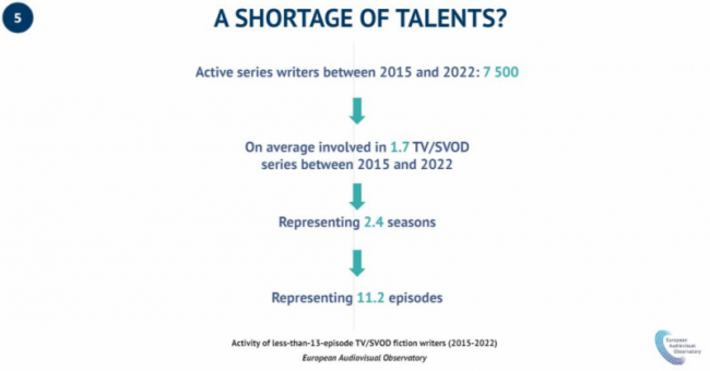 Общее количество активных сериальных сценаристов в Европе между 2015 и 2022 годами составило 7 500 человек. В среднем сценаристы в этот период участвовали в создании 1,7 сериала, порядка 2,4 сезонов и около 11,2 эпизодов.