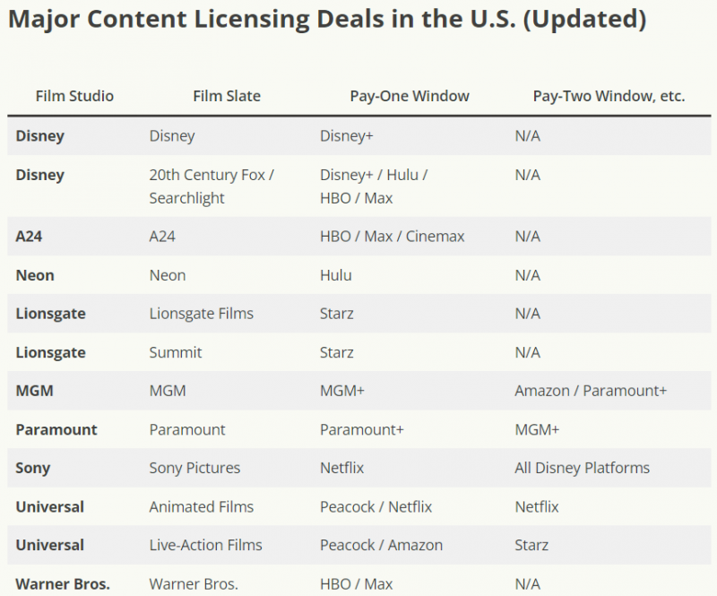В свою очередь, Prime Video предлагает подборку фильмов Universal и Paramount, а также картин Amazon MGM после выпуска на MGM+. Стриминговые сервисы Disney показывают фильмы Sony, а Hulu стал местом для дистрибьюции лент независимого прокатчика Neon после их кинотеатрального релиза. Universal заключила дополнительную сделку с Lionsgate на трансляцию своих фильмов на Peacock после их показа на Starz.