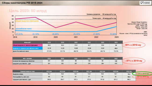 Однако первый квартал 2024 года (выручка 18,6 млрд рублей) стал суперприбыльным по заработанным средствам, он опережает аналогичный период успешного 2019 года на 13%. Но спикеры подчеркивают, что сейчас снова наступил контентный голод, и «заполнив полгода российскими хорошими релизами, остальные полгода остаются на очень низком уровне, и кинотеатры не могут рассчитывать, что завтра получат контент, который привлечет в итоге необходимые 126 млн зрителей».
