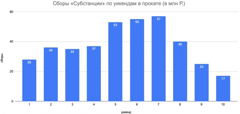 10 уикенд стал еще одной пиковой точкой (832 млн) — за счет стартовавшего под восьмое марта «Онегина» Сарика Андреасяна и все того же третьего «Льда», но уже на четвертой неделе.