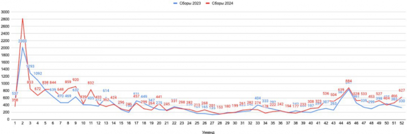 Первый после новогодних праздников пик в обоих случаях приходится на середину-конец февраля. В 2024 году 7 и 8 уикенды продемонстрировал локальную вершину (920 млн) — причем более половины сборов обеспечили «Лёд 3» на первой и второй неделе проката, а также «Мастер и Маргарита» на четвертой и пятой.