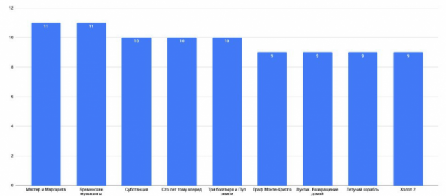 Из дистрибьюторов в Топ-10 уверенно доминируют Вольга (5 фильмов) и Атмосфера кино (3 фильма).