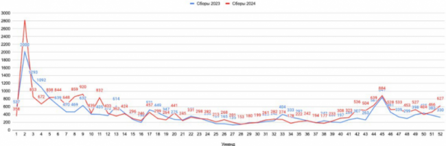 С 21 декабря 2023 года по 25 декабря 2024 года размер «серой» кассы составил 4,4 млрд рублей, что незначительно превышает аналогичный показатель 2023 года (4,2 млрд). С учетом «черных» сборов общий бокс-офис теневого проката может быть равен порядка 5,3 млрд рублей.