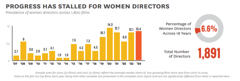 В отчете сообщается, что из 112 рассмотренных постановщиков всего 15 были женщинами (13,4%) — это почти эквивалентно 12,1% в 2023 году. Несмотря на то, что эти данные значительно лучше результатов 2007 года, когда только 2,7% режиссеров были женщинами, изменения происходят очень медленно — за 18 лет (с 2007 по 2024) количество женщин-режиссеров самых кассовых фильмов в прокате США составило всего 6,6%.