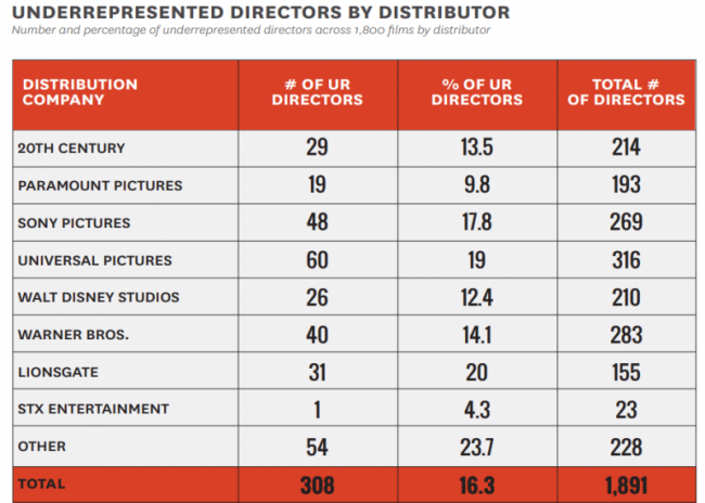 Universal Pictures (9,5%, 30 женщин-режиссеров) и Lionsgate (20%, 31 режиссер из недостаточно представленной расовой/этнической группы) лидируют среди всех остальных кинокомпаний.