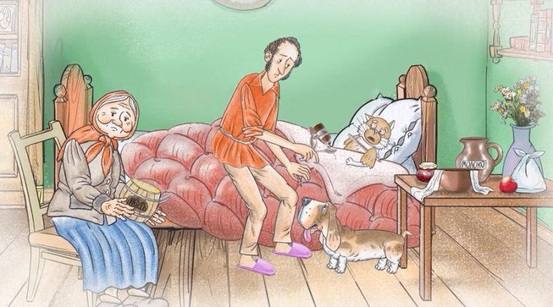 Мы также познакомились с людьми, которые здесь долго живут и которых так же, как и нас, интересует жизнь и творчество Пушкина. Одним из них стал Игорь Шаймарданов, который рисует Пушкина уже 20 лет. На его картинах он живет обычной деревенской жизнью — ходит в баню, на рыбалку. Создание анимационного фильма про поэта было его мечтой. Мы, как большие почитатели Пушкина, вдохновились этой идеей и попробовали посмотреть на персонажа, созданного на рисунках, именно с позиции его оживления как героя анимационного фильма.