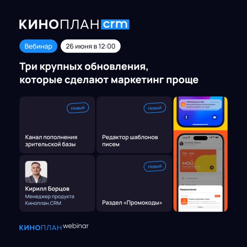 26 июня в 12:00 по московскому времени в прямом эфире состоится вебинар компании Киноплан, посвященный CRM-системе для кинотеатров. На онлайн-мероприятии будет подробно рассказано про три обновления, нацеленные на упрощение работы с аудиторией и расширение возможностей маркетинга — Новый канал пополнения базы, Редактор шаблонов писем и Промокоды.