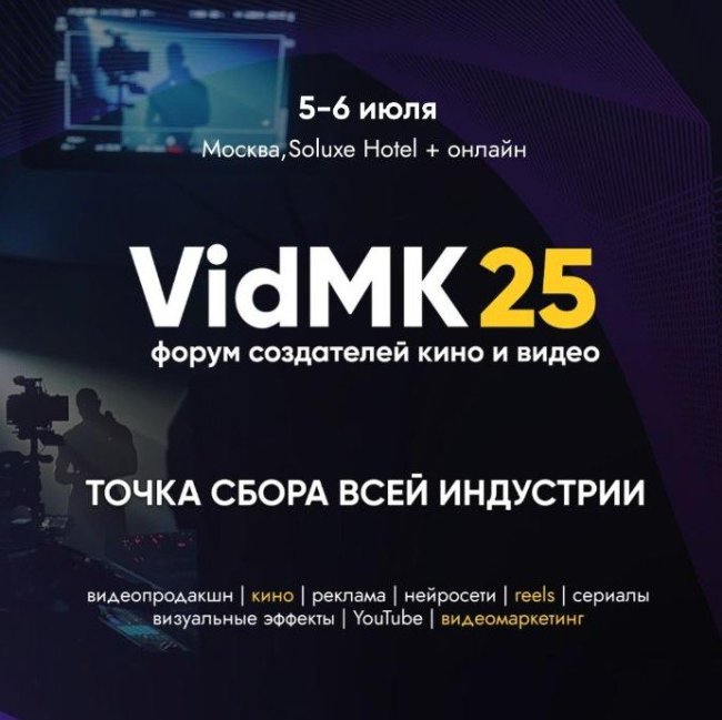 5 и 6 июля 2025 года в Soluxe Hotel Moscow состоится VidMK25 — IX ежегодный форум и главная площадка для профессионалов кино- и видеопроизводства в России. Мероприятие пройдет в гибридном формате: более 2000 участников соберутся в Москве, а также к трансляции присоединятся представители индустрии из всех регионов страны. VidMK25 — крупнейший форум в России для тех, кто создает кино и видео. Он объединит профессионалов всех ключевых направлений: руководителей видеопродакшенов и агентств, режиссеров, продюсеров, операторов, монтажеров, VFX-специалистов, ИИ-художников, мобильных креаторов, маркетологов, блогеров, экспертов по видеорекламе и продвижению. На площадке форума будут работать 7 тематических залов, дополнительные студии и пространства для нетворкинга, выставка оборудования, залы для встреч с клиентами и партнерами, питчинги проектов, инвестиционная сессия, а также практические мастер-классы от ведущих экспертов отрасли. Участники отмечают высокое качество контента, насыщенную программу и возможность общения на равных с лидерами индустрии. Это не просто конференция, а платформа для построения прочных связей, поиска партнеров, подрядчиков и новых бизнес-направлений. На форуме выступят более 100 спикеров — практиков, каждый из которых является активным участником рынка. В числе приглашенных: медиа-менеджеры, режиссеры, продюсеры, специалисты по графике, AI и визуальным эффектам, представители крупнейших медиа платформ и продакшенов. Формат мероприятий позволяет не только слушать, но и взаимодействовать со спикерами, задавать вопросы, получать обратную связь. На VidMK25 впервые открывается зал, созданный исключительно для инвесторов, заинтересованных в проектах киноиндустрии. Это не питчинг и не защита идей, а площадка для обмена опытом, анализа кейсов и установления партнёрств. Участников ждут: - разбор реальных кейсов инвестирования — и удачных, и проблемных; - закрытые дискуссии с продюсерами и коллегами-инвесторами; - парад готовых проектов, уже запущенных на рынке; - нетворкинг высокого уровня и инсайты вне публичного поля. Зал для инвесторов — это возможность понять, как эффективно заходить в индустрию контента, влиять на ее развитие и находить партнёров, говорящих на одном языке. Одним из приоритетов форума остается объединение профессионального сообщества с образовательной средой. Второй год VidMK25 поддерживает киношколы и креативные направления вузов, предоставляя возможность бесплатного участия студентам с лучшими показателями. Для индустрии это реальный способ найти и привлечь молодых специалистов, а для студентов — шанс выйти в профессию с поддержкой сообщества. В рамках форума пройдут открытые питчинги сериалов, шоу и документальных проектов. Жюри, в состав которого входят представители крупнейших онлайн-кинотеатров, телеканалов и медиахолдингов, отберут лучшие идеи для дальнейшей реализации. Проекты, получившие высокую оценку, будут рекомендованы к производству и получат шанс на сотрудничество с крупными продакшенами. Основные события VidMK25: Лекции от ведущих практиков кино- и видеопроизводства; Панельные дискуссии по актуальным вопросам индустрии; Мастер-классы по съемке, монтажу, свету и работе с ИИ; Выставка современной техники с возможностью тестирования; Профессиональный разбор работ участников; Питчинг авто