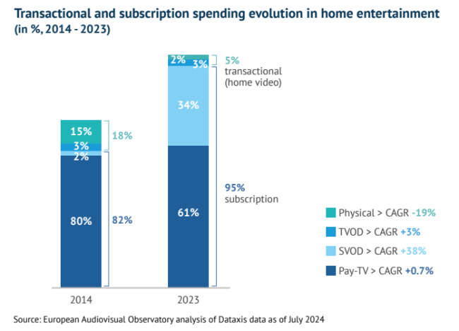 Общий объем рынка домашнего видео в Европе потерял почти две трети своих доходов в период с 2014 по 2023 год (до 2,8 млрд евро). Это произошло в основном из-за резкого падения рынка физических видеоносителей.