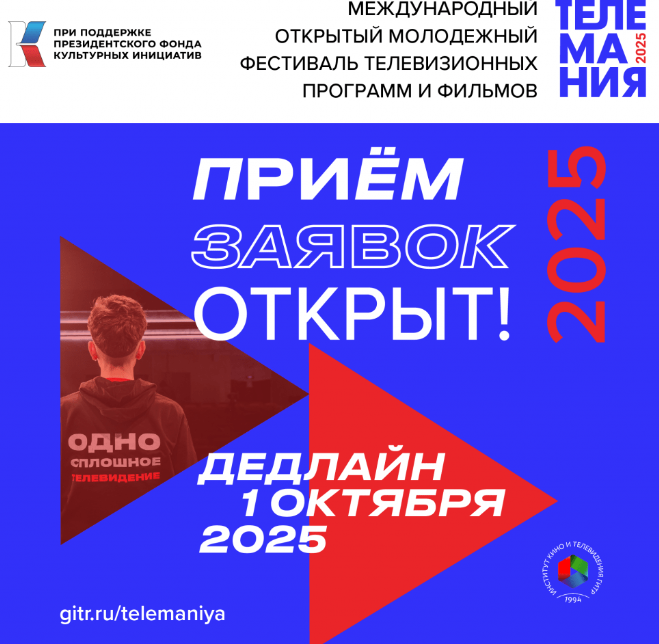 Международный открытый молодежный фестиваль телевизионных программ и фильмов Телемания продолжает прием заявок. В рамках Телемании запланированы образовательные мастер-классы представителей медиаиндустрии, а также кинотеатральные показы в Институте кино и телевидения (ГИТР) и на партнёрских площадках. 16 ноября для номинантов Телемании (шорт-лист) предусмотрен день интенсивов в Институте кино и телевидения (ГИТР) при участии медиапрофессионалов. Торжественная церемония награждения победителей фестиваля состоится во Всемирный день телевидения 21 ноября в концертном зале Останкино. В фестивале могут принять участие только работы, произведенные в 2024-2025 учебном году. Участник фестиваля имеет право представить в каждой номинации любое количество проектов. Возрастной ценз фильмов — 16 . Хронометраж работ — до 30 минут. Цель фестиваля: найти, наградить и мотивировать к работе в современных медиа талантливых и креативных молодых режиссёров, журналистов, драматургов, операторов, звукорежиссёров, продюсеров и художников, способствовать их карьерному росту и продвижению. Для того, чтобы выслать свою работу на рассмотрение, необходимо заполнить онлайн-заявку. Дедлайн: до 1 октября 2025 года. Международный открытый молодежный фестиваль телевизионных программ и фильмов Телемания учрежден Институтом кино и телевидения (ГИТР) в 2003 году, проводится под патронажем Международной академии телевидения и радио (IATR). Программы Телемании 2025 Телемания Jr Принимаются работы учащихся общеобразовательных школ и средних специальных учебных заведений. Телемания, основной конкурс Принимаются учебные, курсовые, дипломные и самостоятельные работы студентов российских и зарубежных вузов, обучающихся по программам высшего образования. Номинации основного конкурса: Лучший репортаж Лучший документальный фильм Лучший игровой короткометражный фильм Лучший web-проект / телевизионная программа Лучшее короткое видео (реклама, клип, арт) Лучшая работа режиссера Лучшая работа журналиста / репортера Лучшая операторская работа Лучшая работа звукорежиссера Лучшая работа художника Лучший сценарий Лучшая работа продюсера Спецприз Звезда ГИТРа Гран-при Телемания Pro Внеконкурсная секция; принимаются работы преподавателей, занимающихся профессиональной деятельностью в области кино и телевидения.