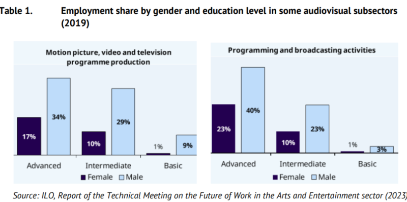 Распределение доли занятых в соответствующих аудиовизуальных секторах по полу и уровню образования в 2019 году демонстрирует преобладание мужчин в сферах кино, видео и ТВ-вещания.