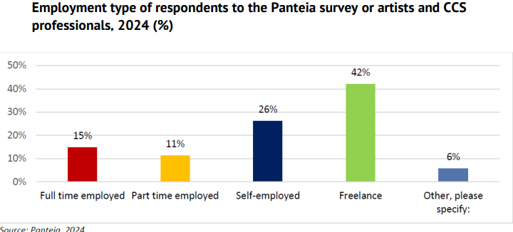 Многие из 7,7 млн специалистов креативного сектора в ЕС сталкиваются с нестабильными условиями труда. Эти проблемы во многом обусловлены широким распространением самозанятости и временных контрактов, которые часто не предусматривают надлежащей социальной защиты, такой как медицинское и пенсионное страхование.