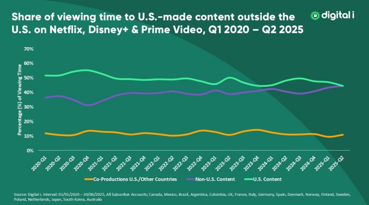 В период с первого квартала 2020 года по второй квартал 2025 совокупная доля времени просмотра американских кино- и теле-проектов на этих платформах в 19 странах снизилась с 52% до 45%.