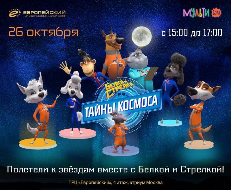 26 октября в ТРЦ Европейский в рамках фестиваля Мультибум пройдет игровая обучающая программа по мотивам известной франшизы анимационной студии КиноАтис «Белка и Стрелка». Все участники смогут не только попробовать себя в викторинах и выиграть призы, но и встретиться с героями сериала «Белка и Стрелка. Тайны космоса».