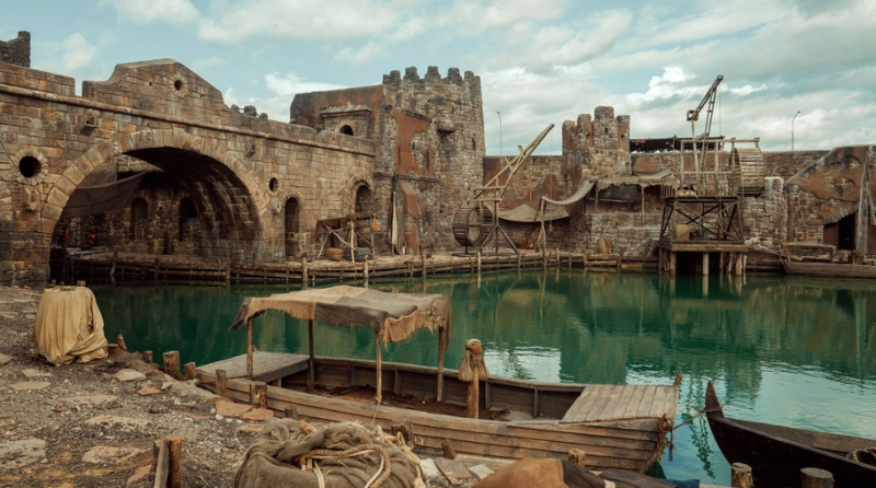 Съемки «Трудно быть богом» прошли в Иране и Москве, в том числе на территории Кинопарка Москино. Здесь были построены декорации, которые по художественной задумке представляют собой сочетание архитектуры средневековой Европы и Востока. Они разместились на площади 6,5 гектара. В создании было задействовано свыше 600 строителей, инженеров, художников, скульпторов и декораторов, а возведение заняло пять месяцев. Декорация включает 48 строений, формирующих полноценный «город» для съемок. Среди них — Дворец Кондора с действующим бассейном в полтора метра, акведук высотой 14 метров и длиной более 30 метров, и огромная акваторная зона площадью 1200 квадратных метров, позволяющая проводить подводные съемки и сложнопостановочные каскадерские трюки. Также на территории объекта была возведена центральная скульптура «Воин на пуме» высотой 17 метров и весом более 20 тонн.