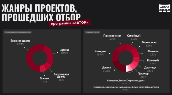 Наиболее популярным жанром среди прошедших основной отбор проектов стала драма (21%). Далее идут комедия (19,7%), приключение (13,1%), семейное кино (6,5), фантастика (5,2). Заявки сценариев военных фильмов составили 5,2%, драмеди и триллера — 3,9%.
