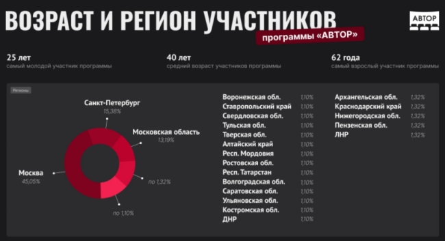 Наибольшее число заявок было прислано из Москвы (45%). Второе место занял Санкт-Петербург (15,3%), а третье — Московская область (13,1%).